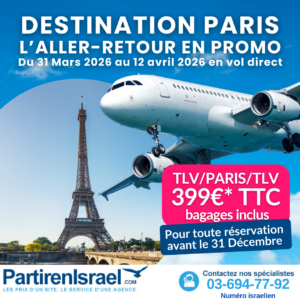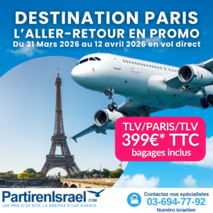 Chaque année, PartirEnIsrael.com met en place des vols directs Paris/Eilat à des prix imbattables. Laissez-vous séduire également par nos offres hôtelières proposées en exclusivité en partenariat avec les luxueux hotels de la chaîne Fattal. Premiers arrivés, premiers servis.
